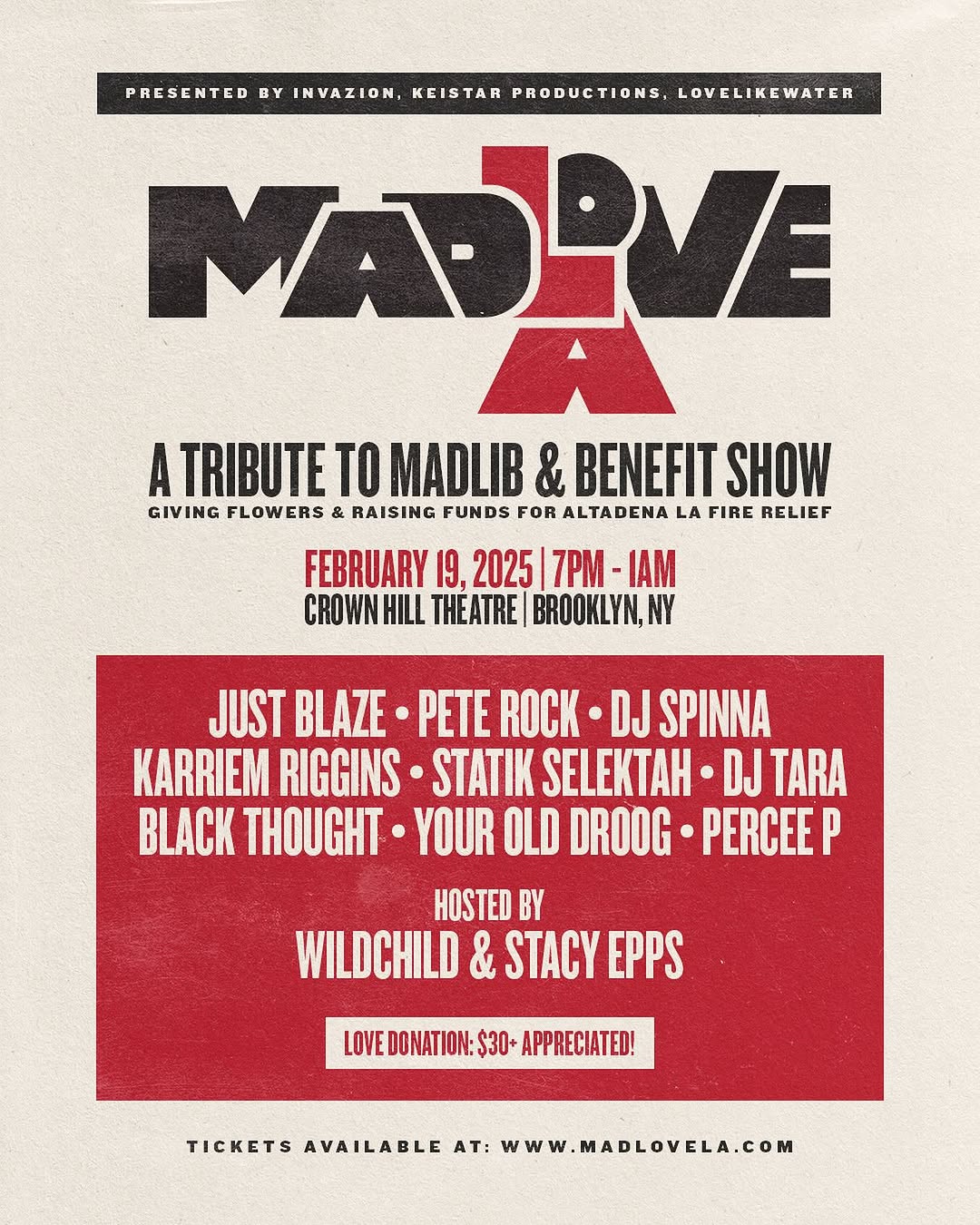 Now, the community is coming together to honor Madlib’s resilience and support fire relief efforts in Altadena. On February 19, “Madlove,” a benefit show dedicated to love, solidarity, and rebuilding, will take place at NYC’s Crown Hill Theatre. This event is more than just a show—it’s a testament to the power of community and a reminder that, together, we can rise from even the greatest challenges.