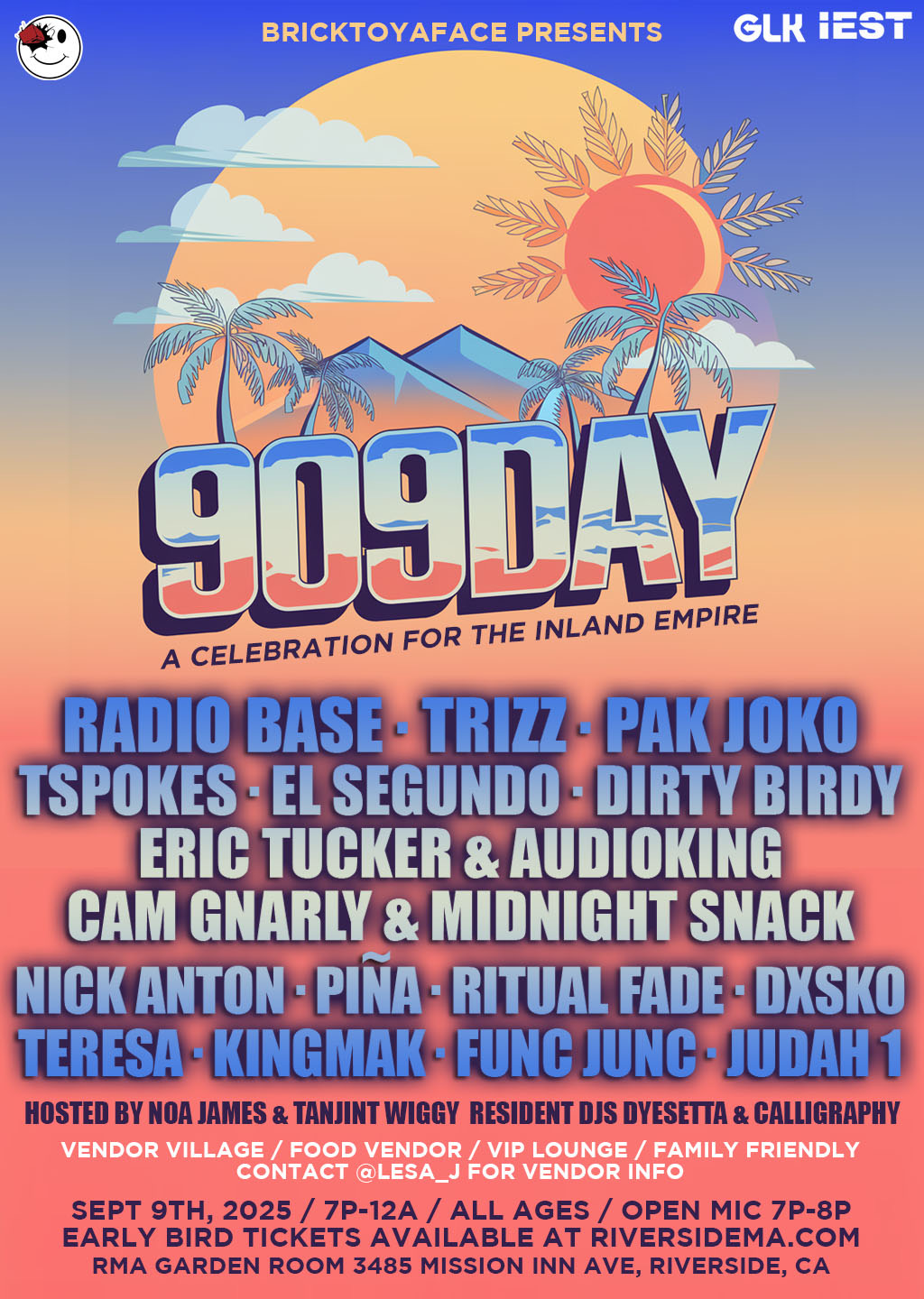 Riverside, CA – Inland Empire’s own Noa James x BrickToYaFace is bringing the city together once again for 909 Day, a yearly celebration of culture, music, and community pride. This year’s event goes down on Tuesday, September 9th from 7 PM to midnight at the RMA Garden Room (3485 Mission Inn Ave, Riverside, CA) and welcomes all ages for a night full of energy and love for the IE.