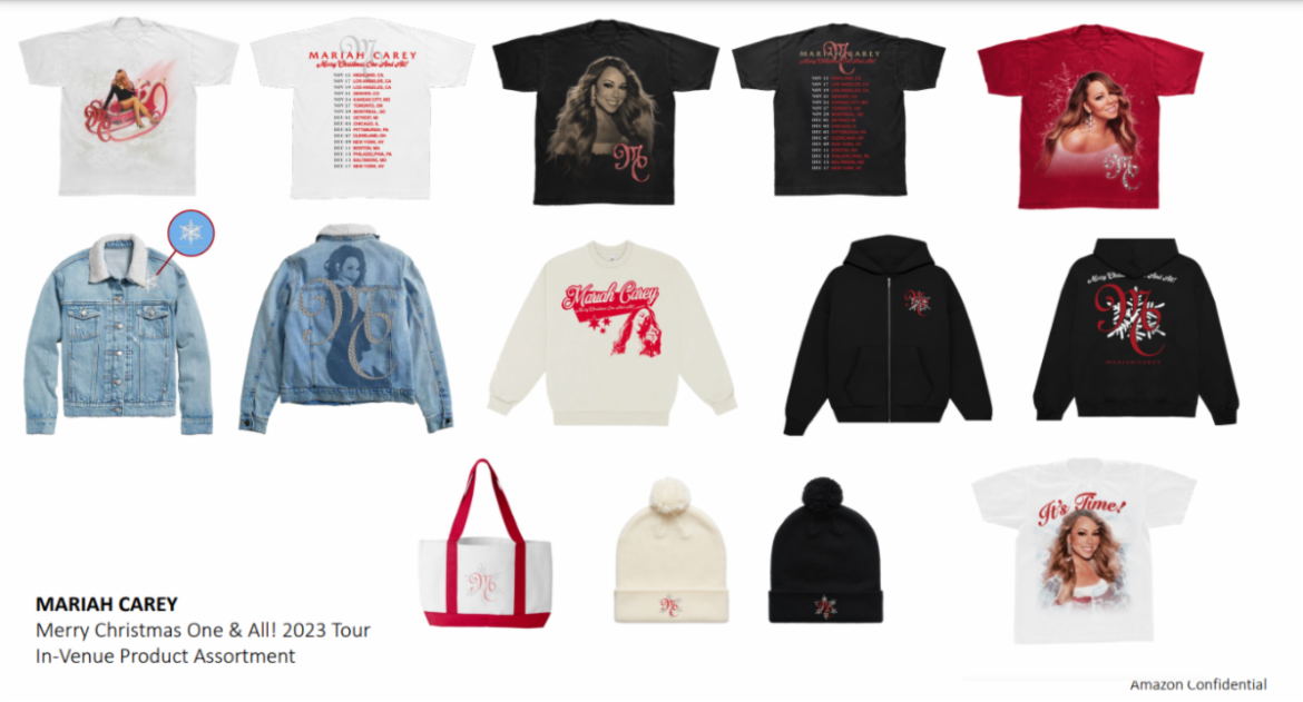 The merch collection celebrates the “Queen of Christmas” and is sure to get everyone in the holiday spirit. Fans can choose from a variety of special, brand new designs across t-shirts, hoodies, hats, totes, and a rhinestone-studded Mariah Carey jean jacket that are only available in venue on Mariah’s tour. In addition to these exclusive tour designs, five other designs will be available on Mariah Carey’s official Amazon store and the Amazon Music Artist Merch Shop.